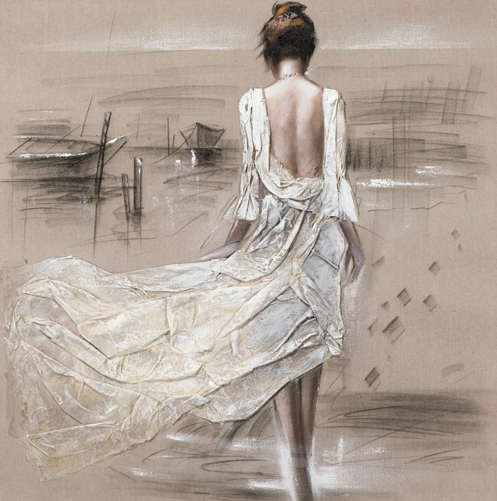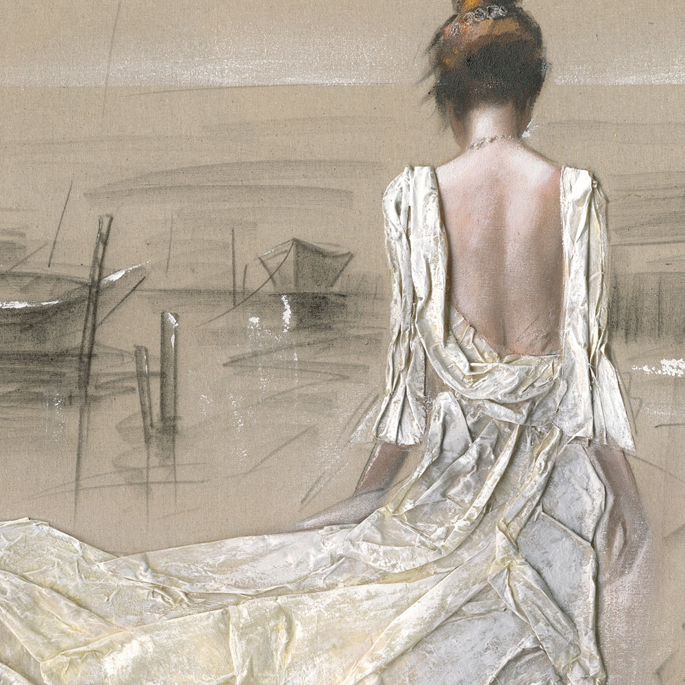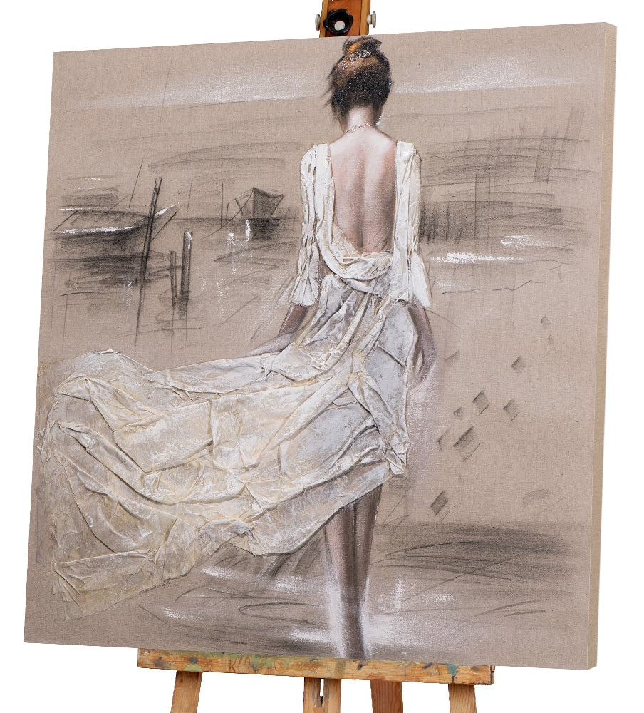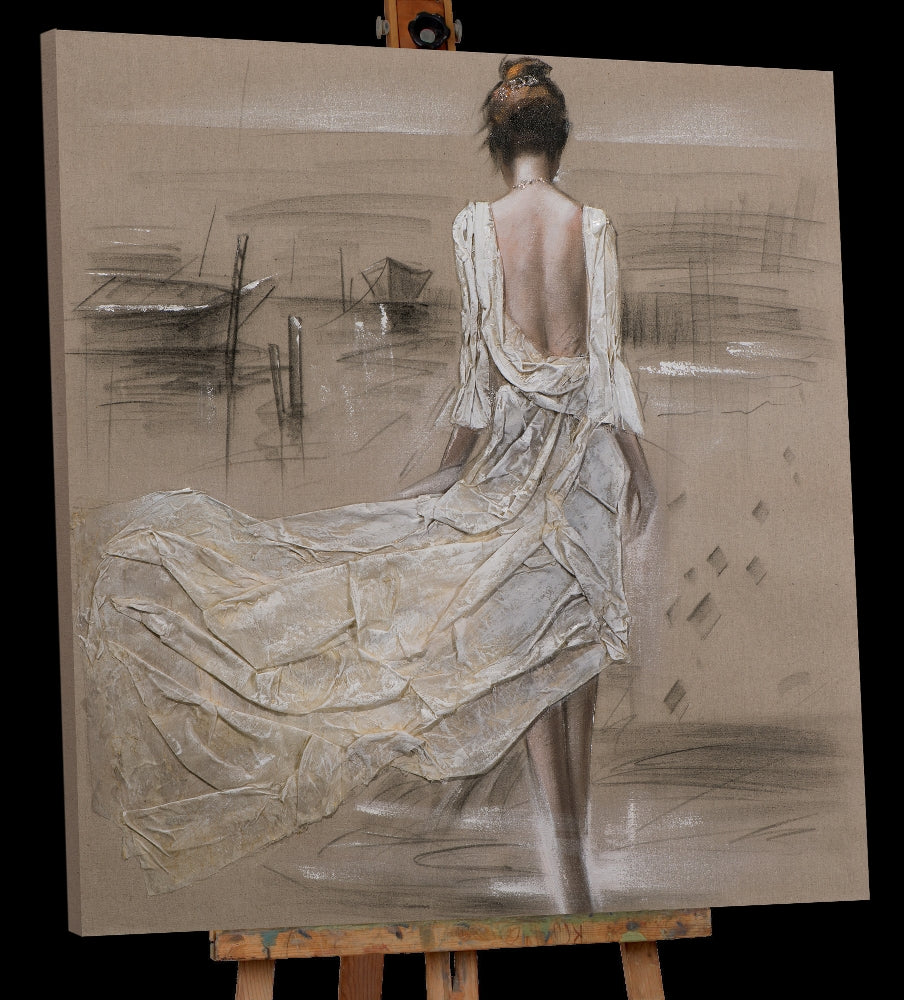 Das besondere hier ist das textile Kleid aus Naturleinen. So entsteht der realistische Eindruck einer Dame im hellen, luftigen Sommerkleid, das im Wind weht. Der Effekt Glitter verleiht dem gesamten Werk einen strahlenden Glanz. Die hellen Pastelltöne erscheinen verspielt und sorgen in jedem Raum für eine Wohlfühlatmosphäre.
