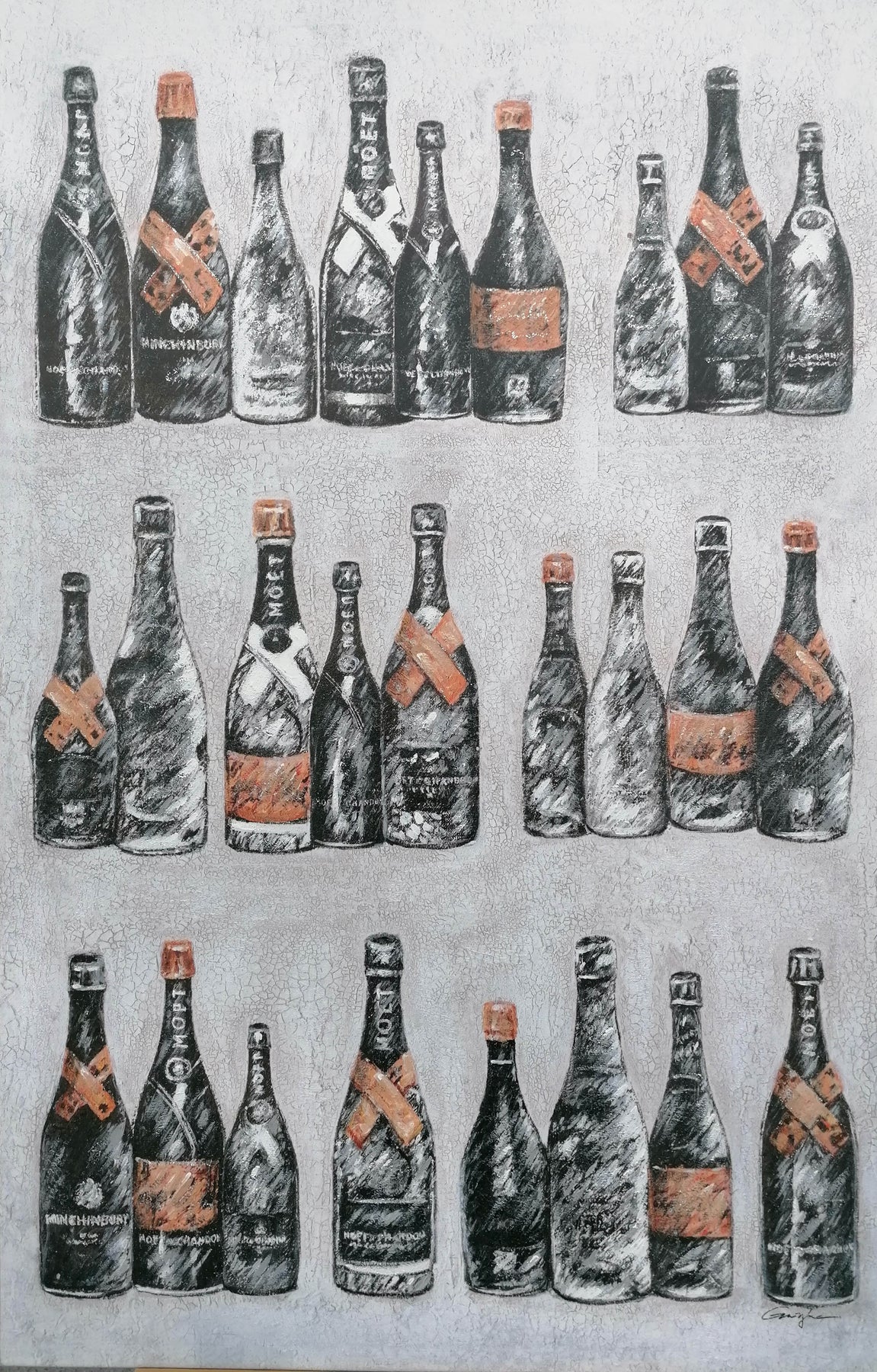 Das Gemälde zeigt eine Ansammlung von Champagnerflaschen, angeordnet in einer aufgeräumten und eleganten Anordnung. Die Hauptfarben des Bildes sind Schwarz und Grau, die eine raffinierte und zeitlose Atmosphäre schaffen.