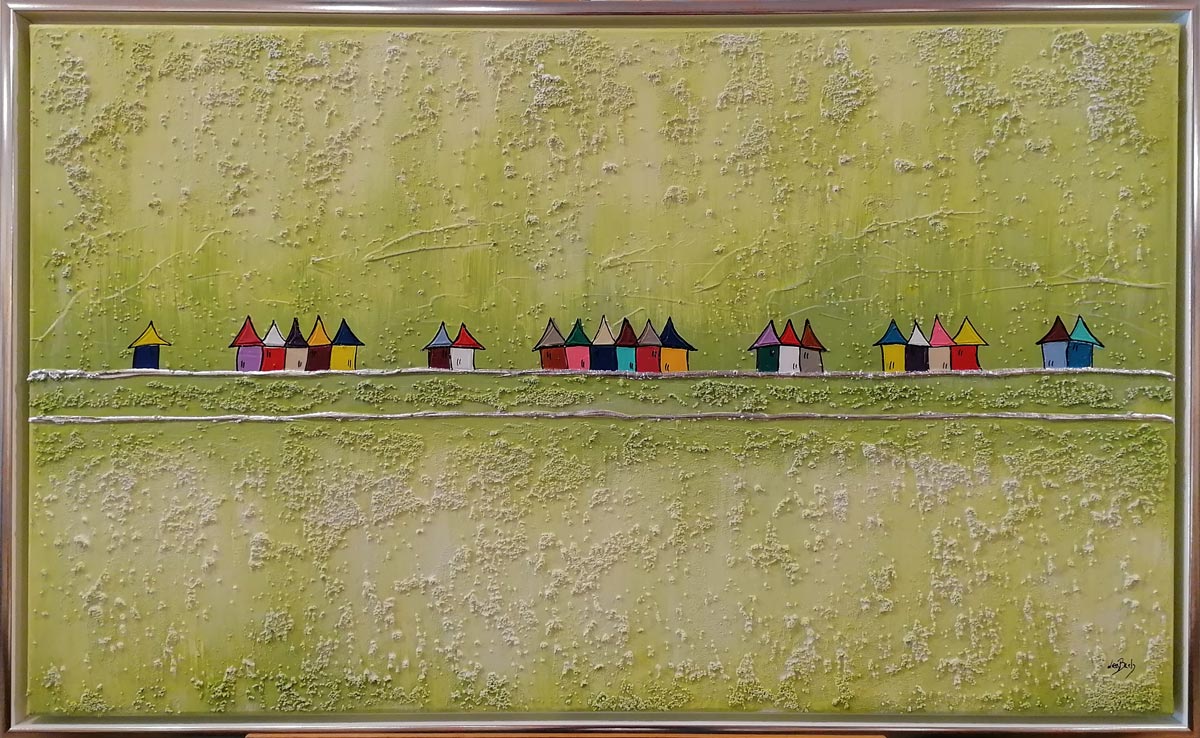 Dieses Werk zeigt farbenfrohe Häuser inmitten einer leuchtenden Berglandschaft. Wie alle Bilder von Lea Bach hat diese Acrylmalerei viel Struktur, durch die verwendete Spachteltechnik erweckt es den Eindruck von Tiefe und zieht den Betrachter in seinen Bann.