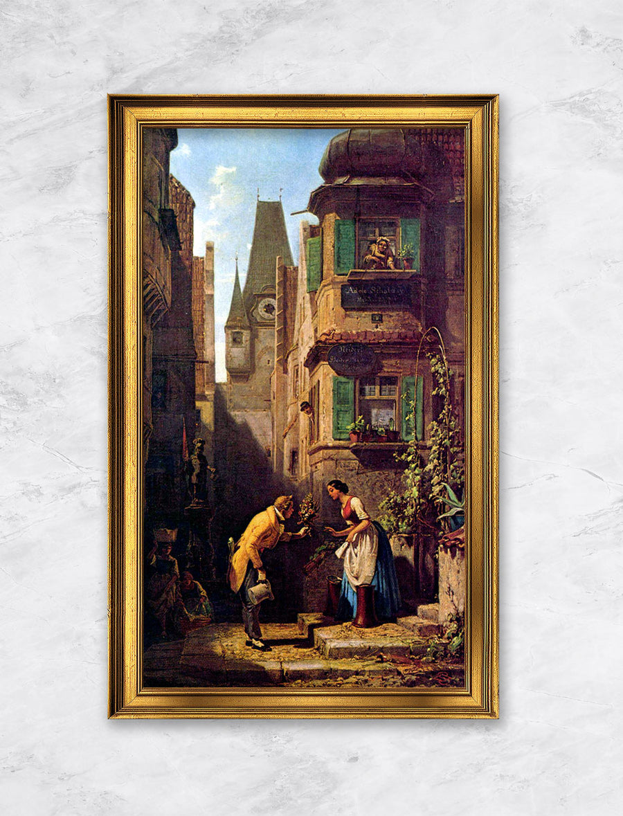 Carl Spitzweg (1808–1885) war einer der bedeutendsten Künstler der Spätromantik und des Biedermeiers. Bekannt für seine detailreichen und humorvollen Darstellungen des bürgerlichen Lebens, fing er die kleinen, idyllischen Momente des Alltags mit feiner Beobachtungsgabe und großer technischer Meisterschaft ein. Seine Werke wie „Der arme Poet“ oder „Der Bücherwurm“ sind ikonische Beispiele seiner Fähigkeit, die Atmosphäre und den Charakter des 19. Jahrhunderts in seinen Bildern festzuhalten.