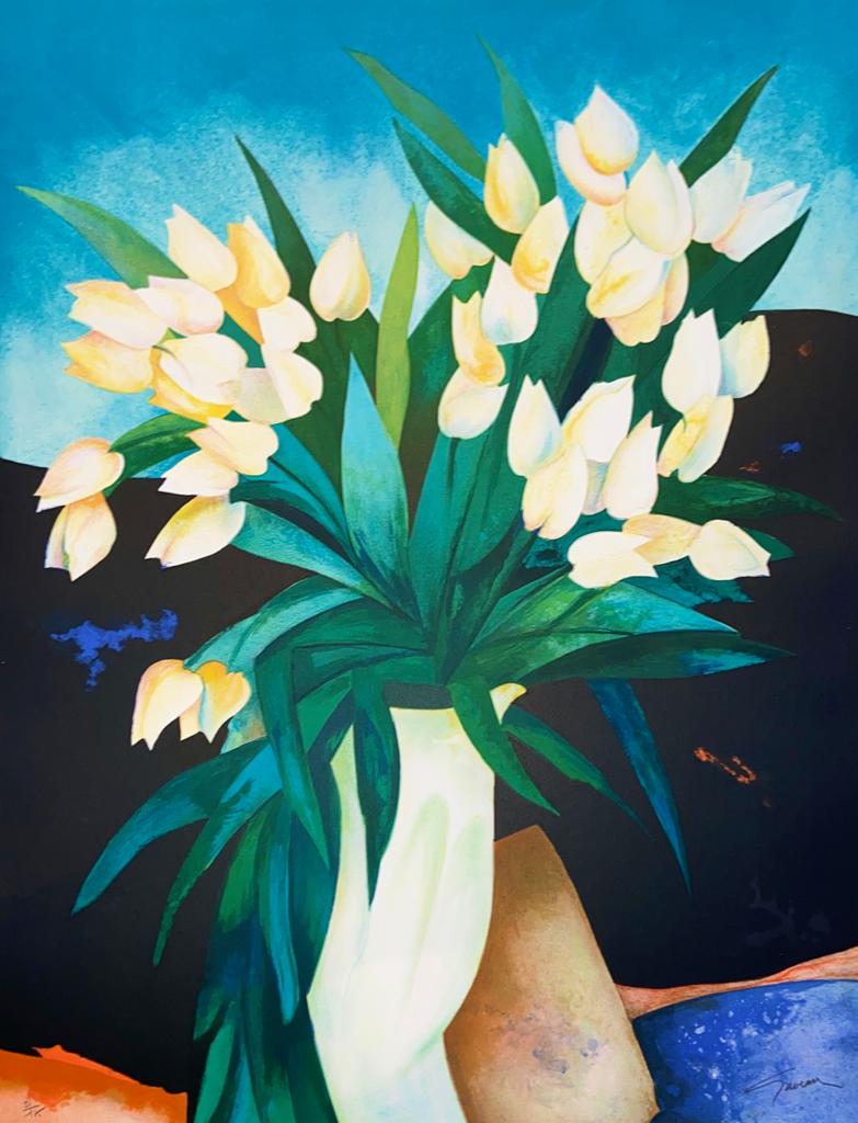 Stilllebenkompositionen. Seine Palette lebhafter Farben, wie mit Seide überzogen, ergibt ein Ergebnis voller Subtilität. Seine Kunst wird oft als "symphonisch" beschrieben, da die Elemente jeder Komposition perfekt ausbalanciert erscheinen, beide aus der Realität heraus, ohne abstrakt zu sein, was ihnen diesen mysteriösen Aspekt verleiht, der so einzigartig und unmittelbar identifizierbar ist.