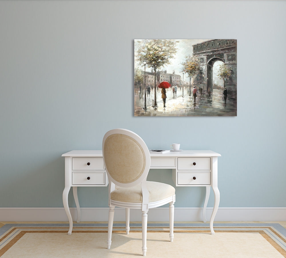 Ein Spaziergang in Paris an einem verregneten Tag - die Menschen laufen mit Schirmen über die Champs-Élysées mit dem Arc de Triomphe im Hintergrund. Eine bezaubernde Komposition in hellen Pastell- und Grautönen, die Sie in eine andere Welt entführt. Entfliehen Sie kurz dem Alltag und träumen Sie sich in die französische Romantik!