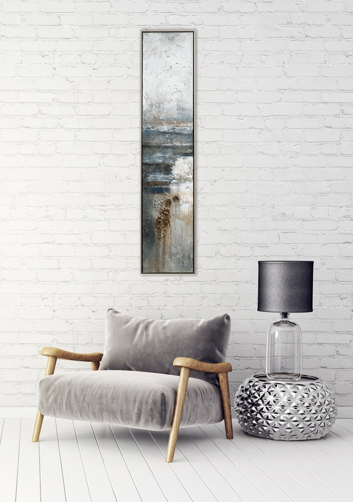 Kunstfertig verleiht unser handgemaltes schlankes abstraktes Bild räumliche Tiefe und lädt zu Interpretationen ein. Das Spiel harmonischer Farben und aufwendige Craquelé-Struktur macht unser Acryl Gemälde zum Blickfang. Fast schwebend im silbernen Schattenfugenrahmen verzaubert es fast jeden Betrachter.