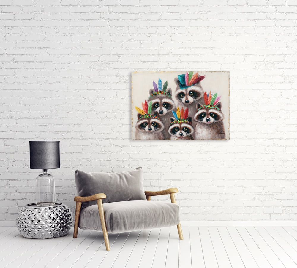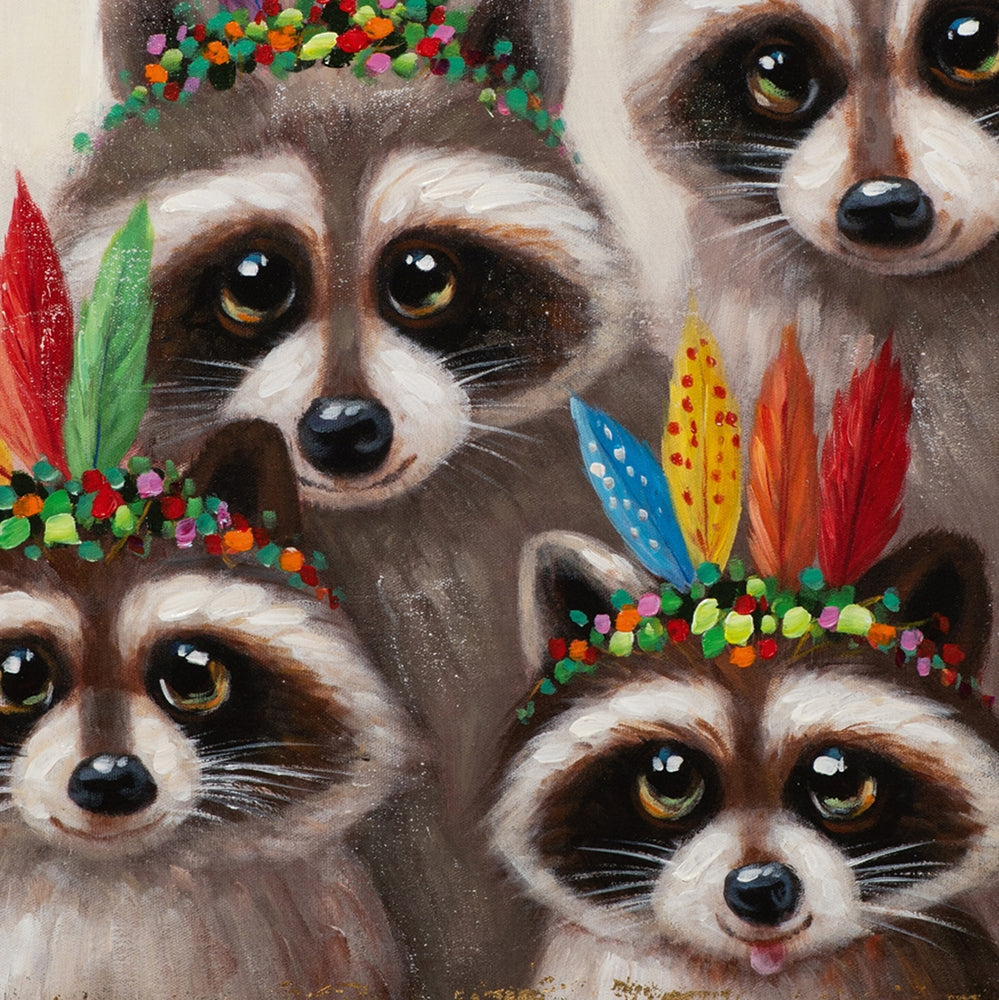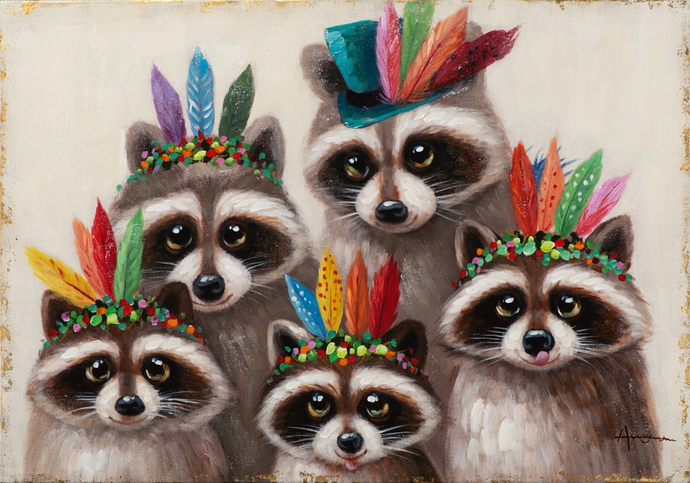 Kontrastreich in schwarz-weiß mit auffallendem Kopfschmuck aus bunten Federn kommt diese entzückende Waschbären Truppe daher. Jeder einzelne Gesichtsausdruck ist einmalig und die farbenfrohen Kopfdekorationen runden die sympathische Ausstrahlung der Waschbären ab.