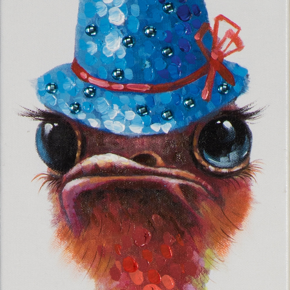 Eine außerordentlich farbenfrohe Straußengruppe, die funkelnde und glänzende Akzente setzt und für gute Laune sorgt. Das Kunstwerk ist mit Effekt Glitter und Glitzersteinen veredelt, die effektvolle Lichtreflexe setzen. Ein edler Blickfang für Ihr Zuhause oder Büro!