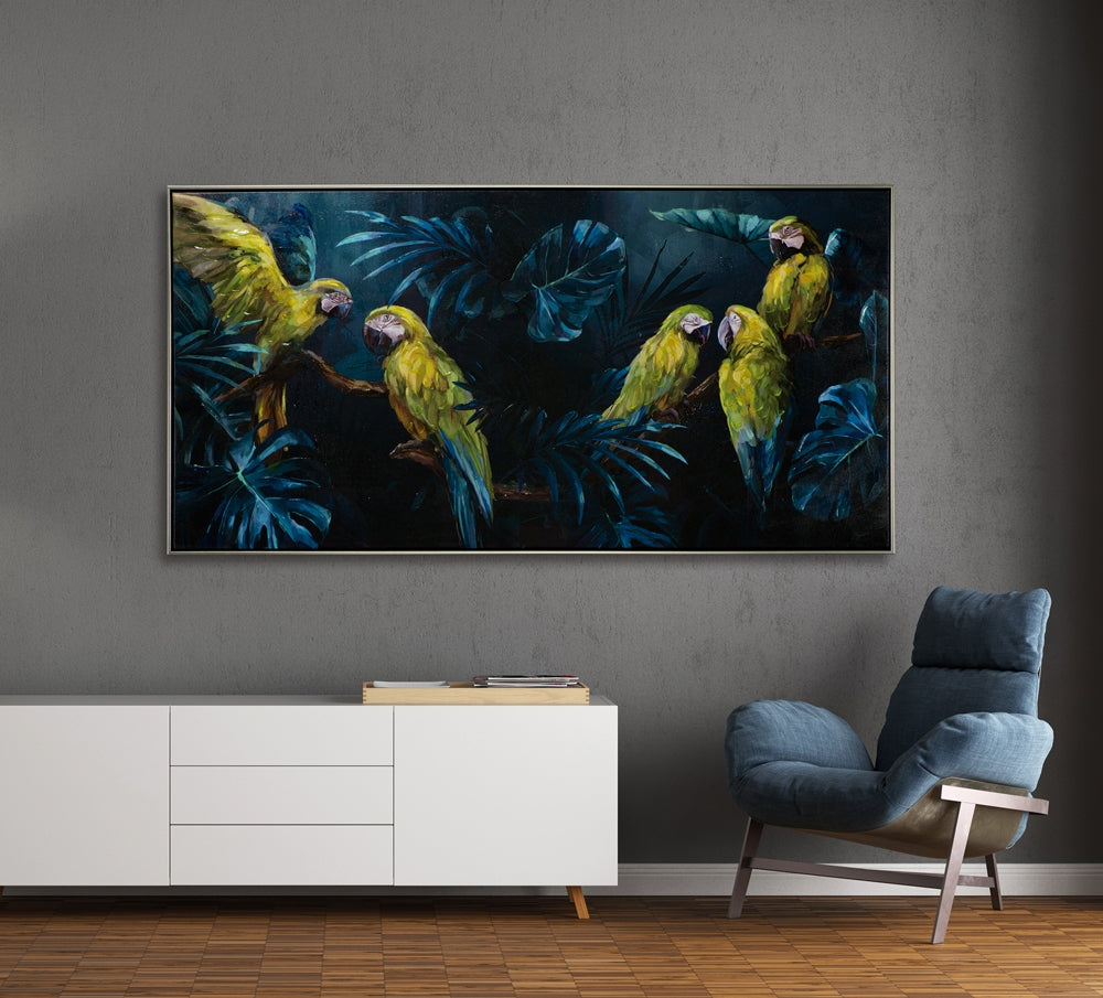 Nicht nur für Papageien-Liebhaber! Ausdrucksstarke Farben machen unser Bild zum wirkungsvollen Blickfang. Hochwertiges Giclée von Hand eindrucksvoll kunstfertig veredelt. Gekonnt erscheint unser Bild räumlich tief und die Papageien fast greifbar. Ein silberfarbiger Rahmen hebt den blauen Dschungel toll hervor.