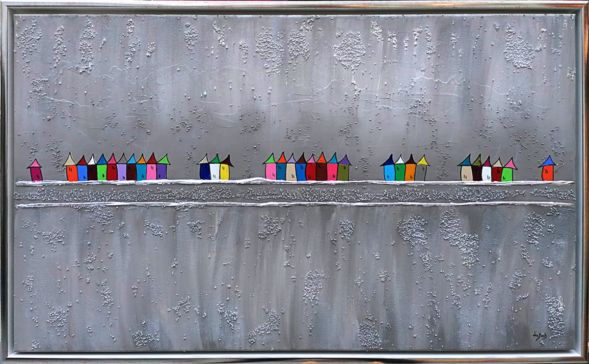 Dieses Werk zeigt farbenfrohe Häuser inmitten einer leuchtenden Berglandschaft. Wie alle Bilder von Lea Bach hat diese Acrylmalerei viel Struktur, durch die verwendete Spachteltechnik erweckt es den Eindruck von Tiefe und zieht den Betrachter in seinen Bann.